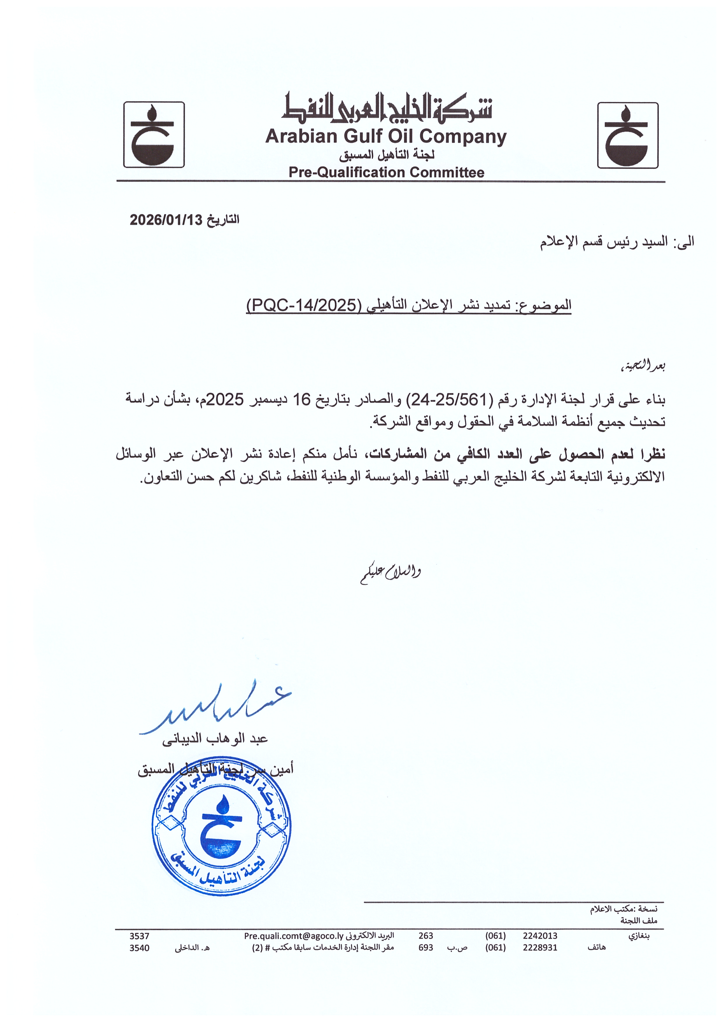 (تمديد الإعلان التأهيلي رقم PQC-14/2025)